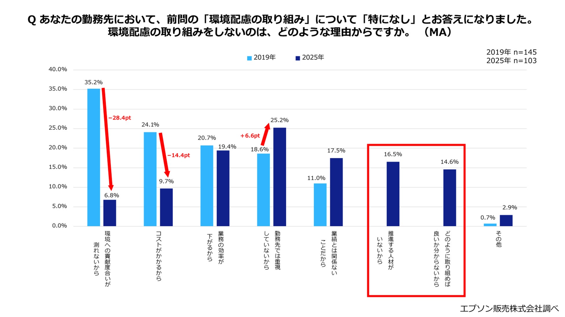 約6年間で環境配慮の取り組みが進む一方で、「推進する人材とノウハウ不足」も課題に
