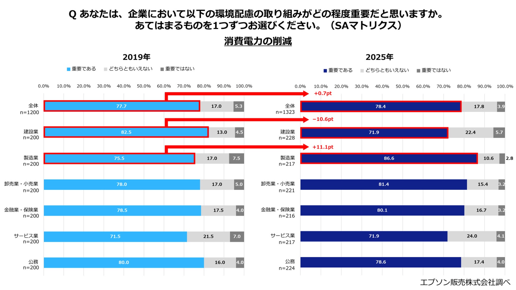 業種別で見ると、製造業は「重要である」「やや重要である」と回答した人の合計が全ての項目で8割を超え、2019年の調査からそれぞれの割合が増加しています。一方、建設業は2019年の調査と比較すると、「消費電力の削減」が71.9%と2019年の82.5%から−10.6ptと最も減少しており、その他の項目を見ても重要だと回答した人の割合が減少しています。全体的に環境配慮の重要性は2019年より高まっている一方で、建設業のみ全ての項目の重要度が低下していることが明らかになりました。