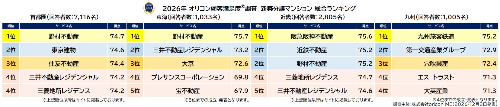 2026年 オリコン顧客満足度®調査 新築分譲マンション(首都圏/東海/近畿/九州)