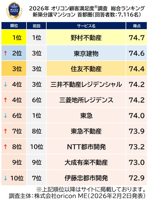 オリコン株式会社(本社:東京都港区 代表取締役社長:小池 恒、略称:オリコン)は、グループ会社である株式会社oricon MEが、実際のサービス利用者を対象に第三者の立場で実施した『新築分譲マンション』の顧客満足度調査の結果を、2026年2月2日(月)14時に「オリコン顧客満足度®」公式サイト内にて発表いたし ました。ランキングの結果は、下記の通りとなりました。