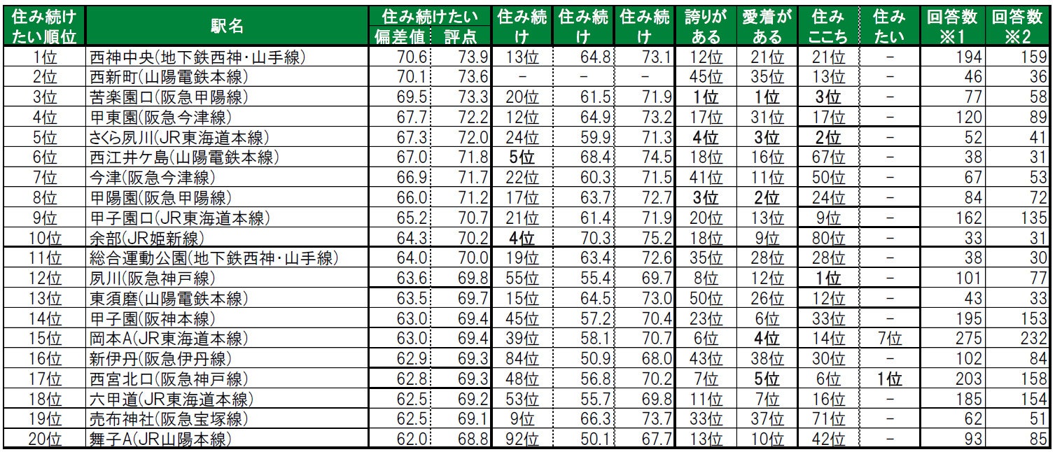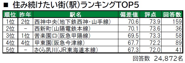1位は西神中央で、「街に誇りがある(駅)」12位、「街の幸福度(駅)」13位の駅です。2位は西新町で、昨年は累計回答数が30名未満だったためランキング集計対象外だった駅です。3位は苦楽園口で、「街に誇りがある(駅)」「街に愛着がある(駅)」1位、「住みここち(駅)」3位と各ランキングで評価の高い駅です。