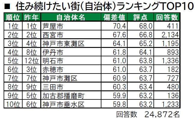 ■住み続けたい街(自治体)トップは、2年連続で芦屋市