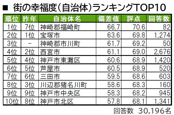 1位は神崎郡福崎町で、「街に誇りがある(自治体)」では7位の町です。2位は宝塚市で、「街に誇りがある(自治体)」6位、「住みここち(自治体)」8位、「街に愛着がある(自治体)」「住みたい街(自治体)」9位と、各ランキングで上位に入っています。3位は神崎郡市川町で、昨年は累計回答数が50名未満だったためランキング集計対象外だった町です。