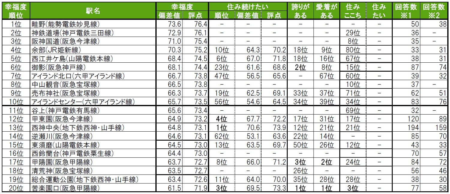 1位は畦野で、「街の幸福度(自治体)」で16位の川西市にある駅です。2位は神鉄道場で、「街の幸福度(自治体)」で10位の神戸市北区にある駅です。3位は阪神国道で、「住み続けたい街(自治体)」で4位の西宮市にあり、「住みここち(駅)」では8位の駅です。