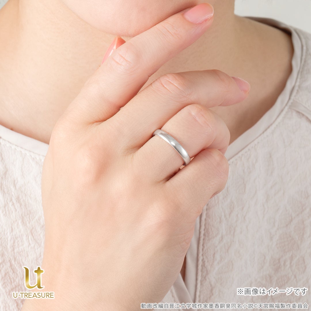 このたびの新作は、謝憐と花城、ふたりのやりとりを内側に中国語で刻印したシンプルなデザインのメッセージリング(指輪)です。表側は装飾のないプレーンなストレートデザインで、永くご愛用いただけるよう着け心地の良さにもこだわりました。