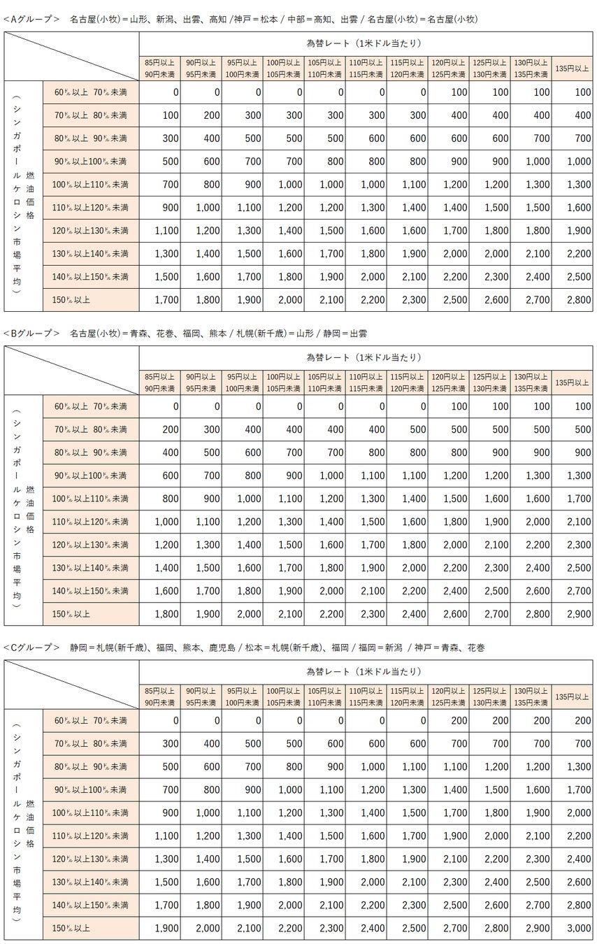 なお、燃油特別付加運賃は、シンガポールケロシン市況価格および為替レートの変動に応じて、 1ヶ月毎に見直しております。