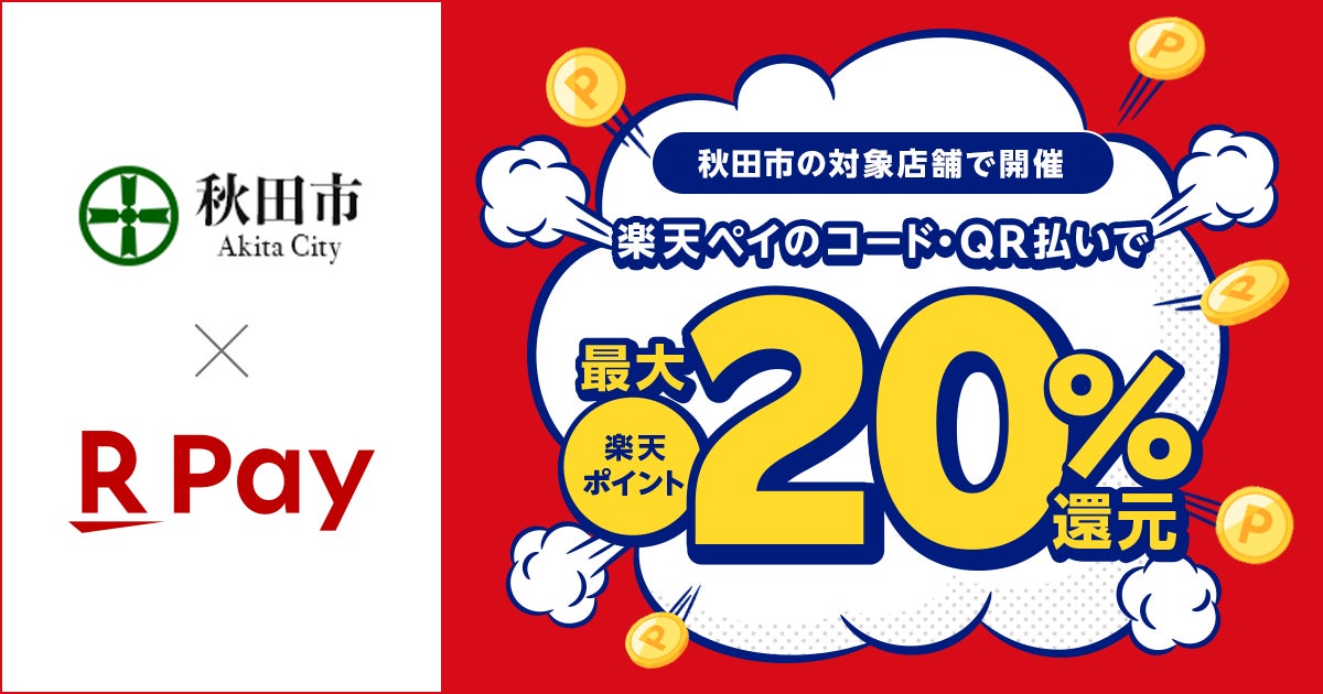 楽天ペイメント株式会社(以下「楽天ペイメント」)は、運営するキャッシュレス決済サービス「楽天ペイ」において、秋田県秋田市が2026年2月20日(金)から5月20日(水)まで実施する「食べてトクトク!最大20%戻ってくる!秋田市キャッシュレスキャンペーン!」に参加することをお知らせします。