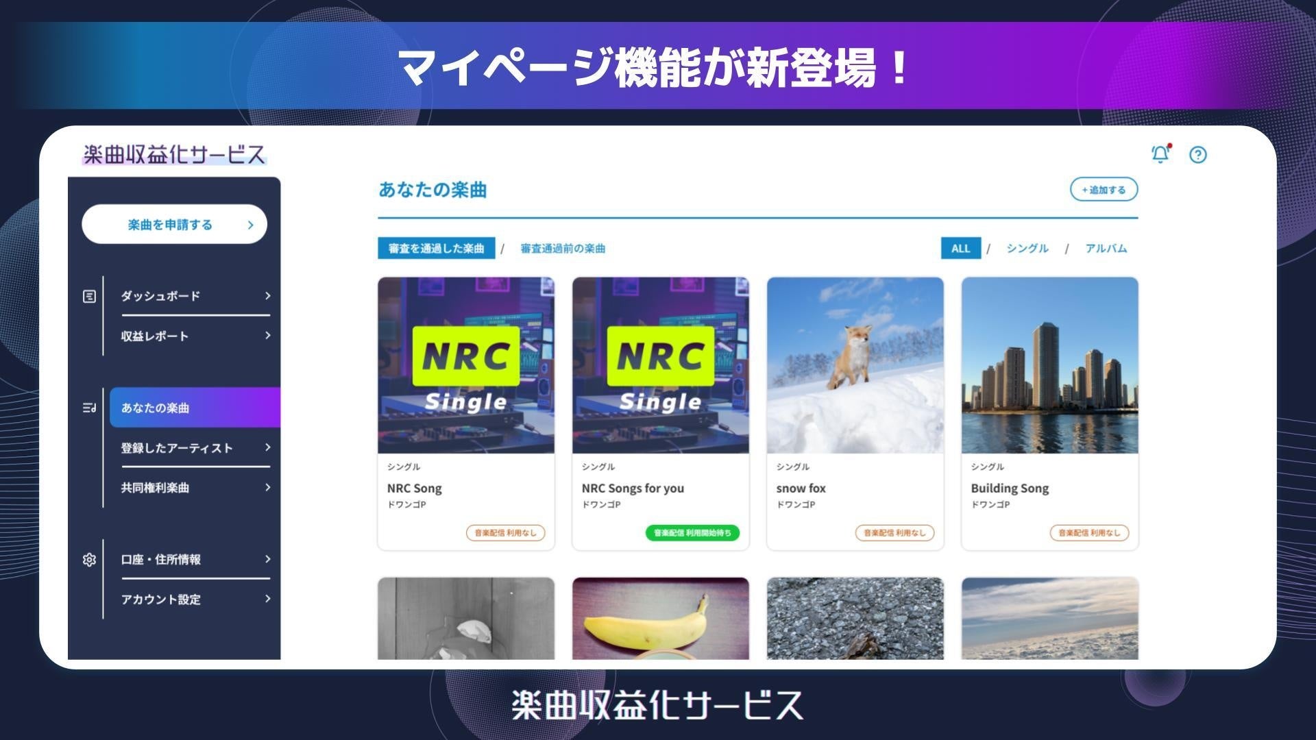 クリエイターが自身の楽曲やアカウント情報を一元管理できるマイページの提供を開始します。同ページでは自身の登録楽曲の申請状況や収益レポートなど各情報を閲覧することができます。また、これまでは楽曲申請のたびに住所や口座などのアカウント情報を入力する必要がありましたが、マイページ上に登録することで、以降の楽曲申請時の入力作業が不要となります。