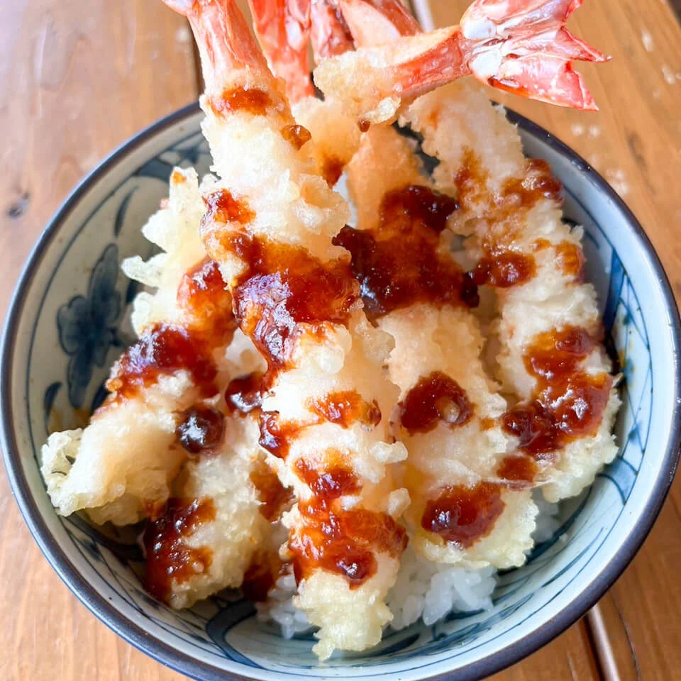 丁寧に下処理したエビをカラッと天ぷらに!直火の釜で炊いた熱々のお米にのせて、天丼のタレをかければエビ天丼の完成!ぜひご賞味ください。