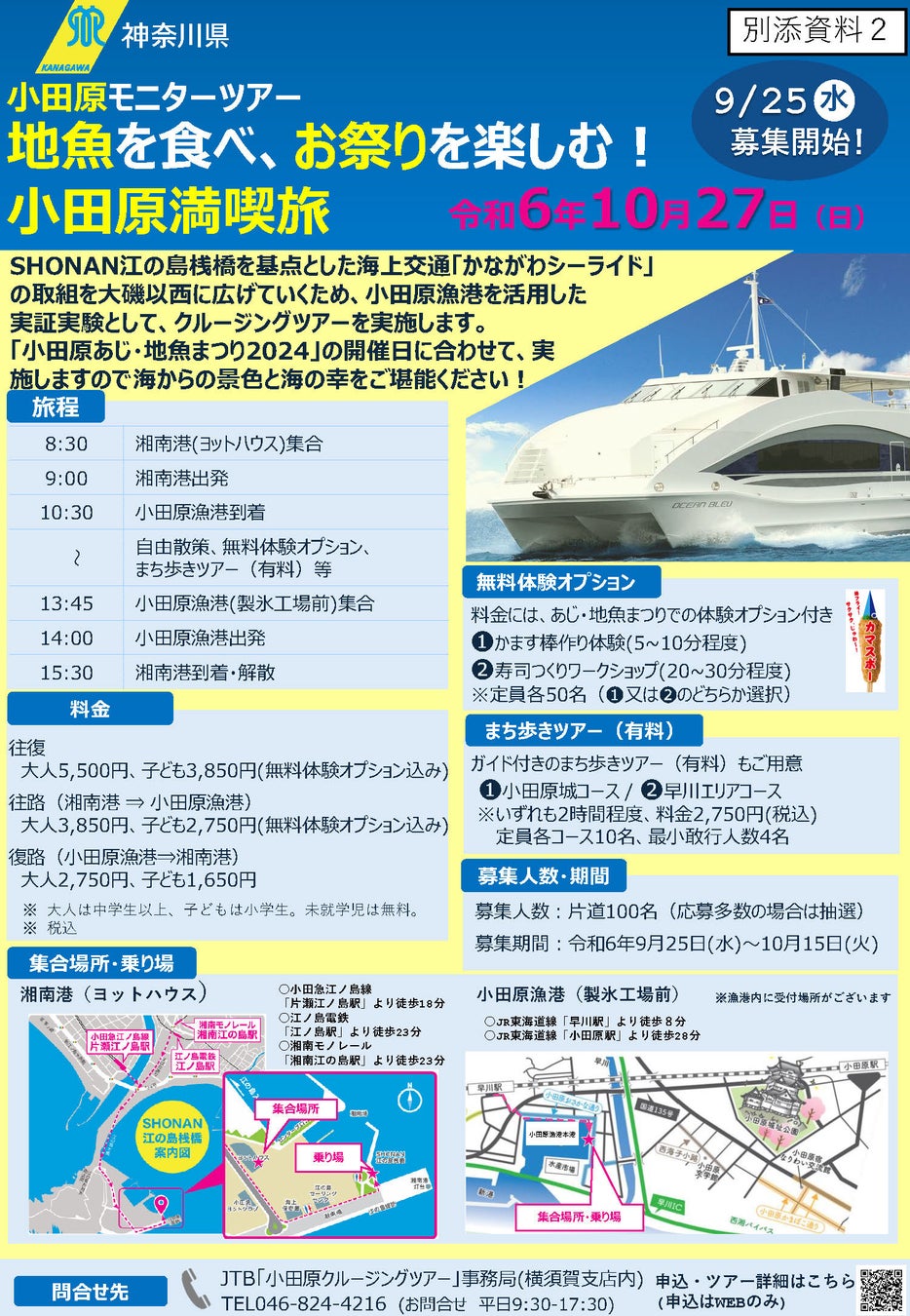 海上交通の取組を大磯以西に広げていくため、小田原漁港を活用した実証実験として、「小田原あじ・地魚まつり2024」の開催日に合わせて、クルージングツアーを実施します。詳細は「別添資料2」をご覧ください。