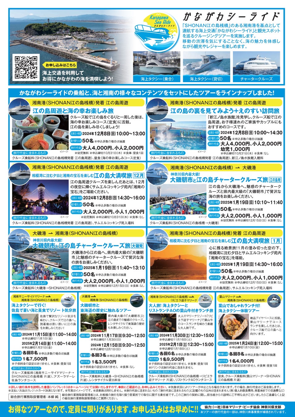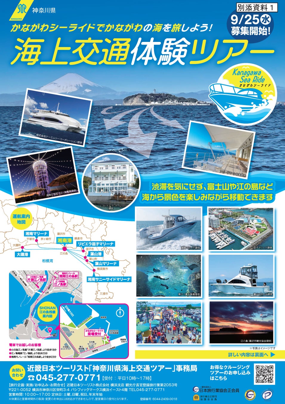 令和6年11月から令和7年2月にかけて、海上交通「かながわシーライド」と観光スポットを組み合わせた以下のクルージングツアーを実施します。詳細は「別添資料1」をご覧ください。