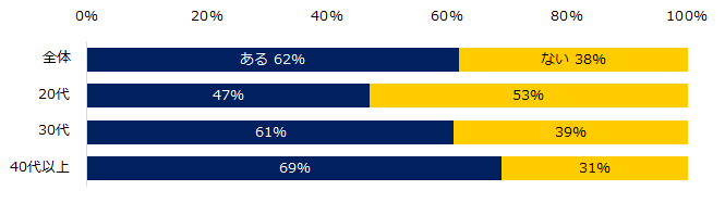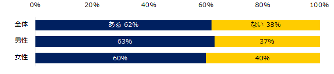 「これまで職場でハラスメントを受けたことがありますか?」と伺うと、62%が「ある」と回答しました。年代別でみると、40代以上が69%と20代の47%より22ポイント高く、年代が高い方ほど、ハラスメントを受けた経験があることが分かりました。男女別では、男性63%、女性60%とほとんど差はない結果となっています。