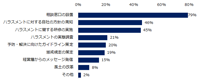 ハラスメント対策のための具体的な取り組みは「相談窓口の設置」(79%)が最多でした。