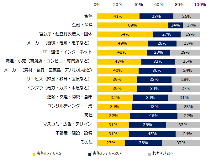 業種別でみると、「実施している」と回答した方が多かったのは「金融・保険」(69%)が最多。次いで「官公庁・独立行政法人・団体」(54%)が続きます。一方、「実施していない」の回答が多かったのは「商社」(46%)、「不動産・建設・設備」(45%)という結果に。