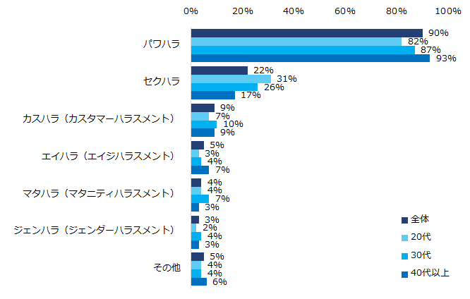 【図4】「職場でハラスメントを受けたことがある」と回答した方に伺います。職場でどんなハラスメントを受けましたか?(複数回答可/年代別)