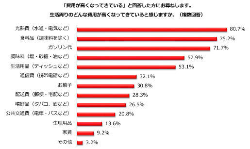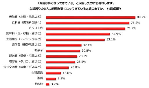 物価高の中、主婦層は今後の生活費をどう予測しているか?「高くなる」93.5%|費用が上がっているもの「光熱費」80.7%、「食料品」75.2%、「ガソリン代」71.7%