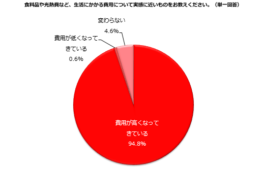 | 1.生活にかかる費用は「高くなってきている」94.8% 2.費用が上がっているもの、1位「光熱費」80.7%、2位「食料品」75.2% 3.今後、生活にかかる費用は全般的に「高くなる」93.5% 4.フリーコメントより |