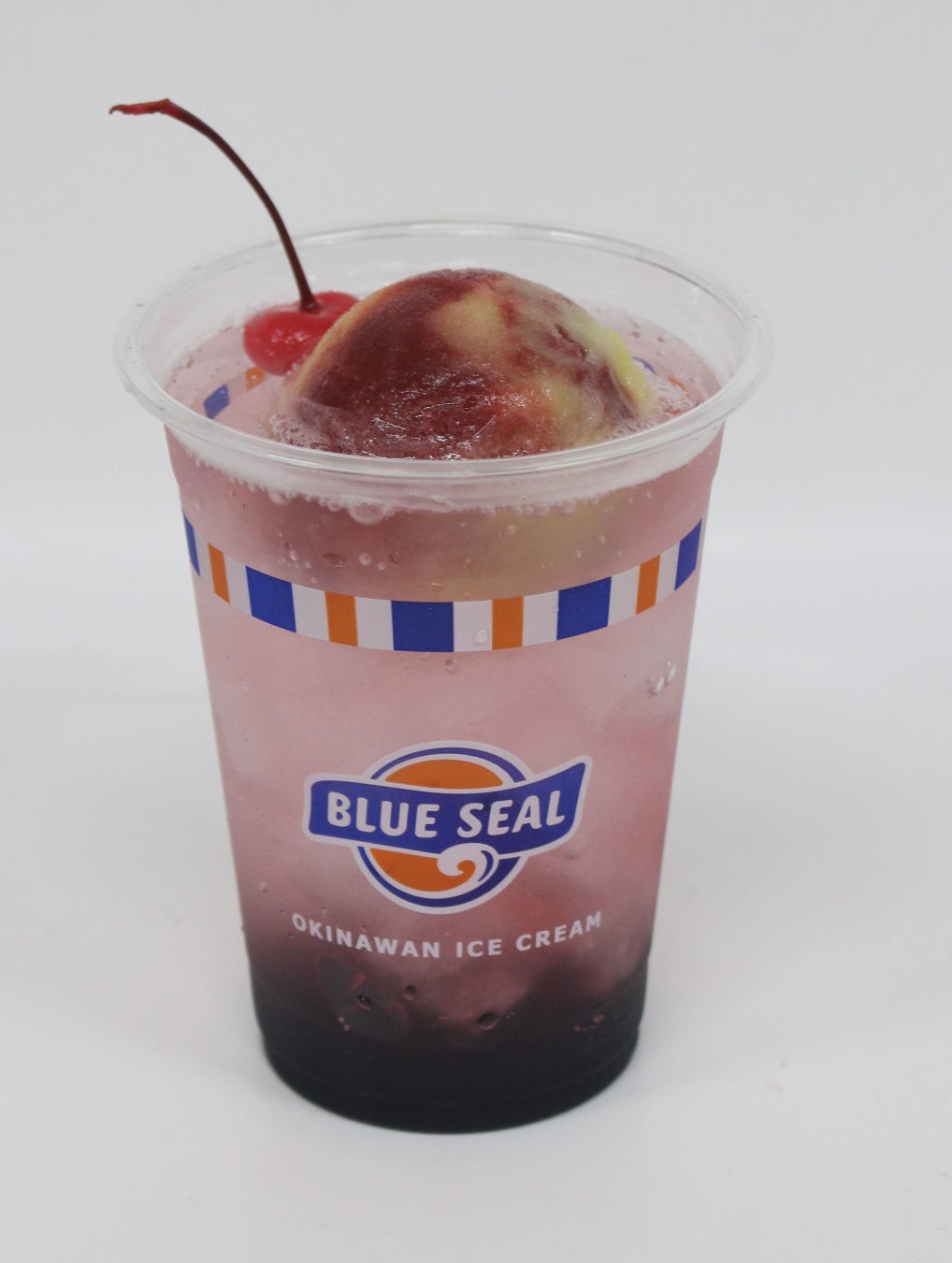 ビルベリーの濃縮果汁を使用したソーダにブルーシールの夏季限定『アメリカンチェリー&沖縄パイン』アイスクリームをトッピングした、酸味の効いたさっぱりとした味わいが夏にぴったりなコラボフロートです。