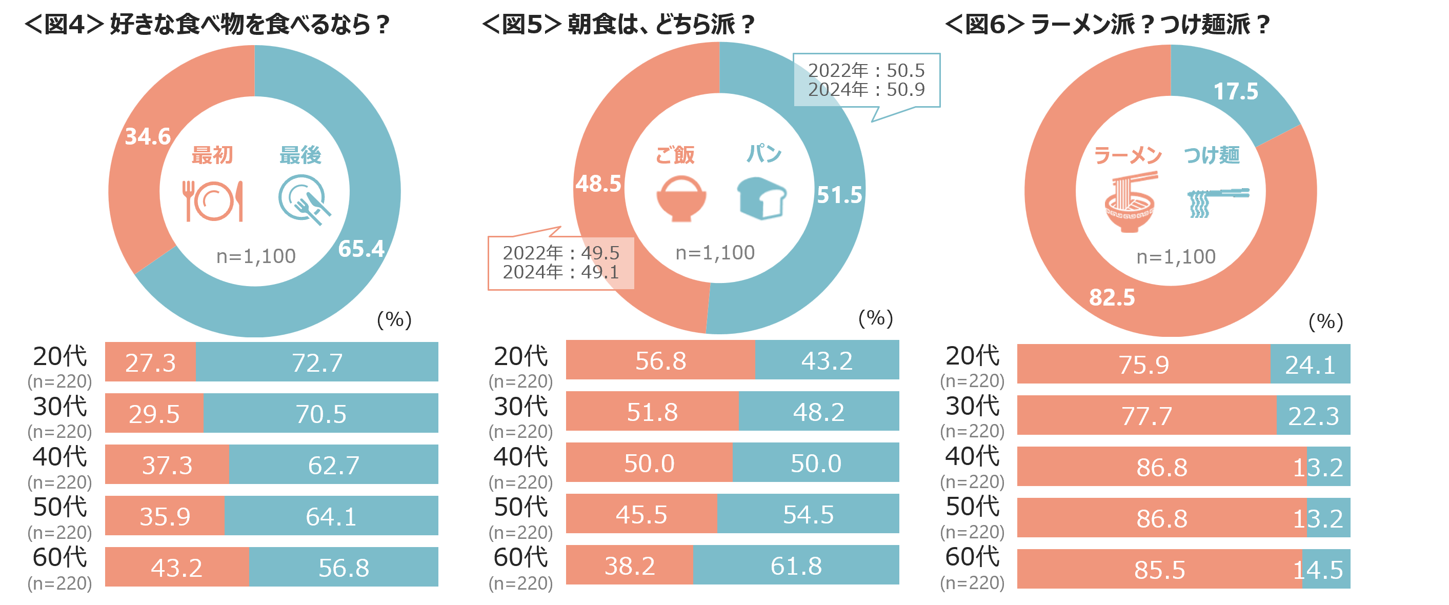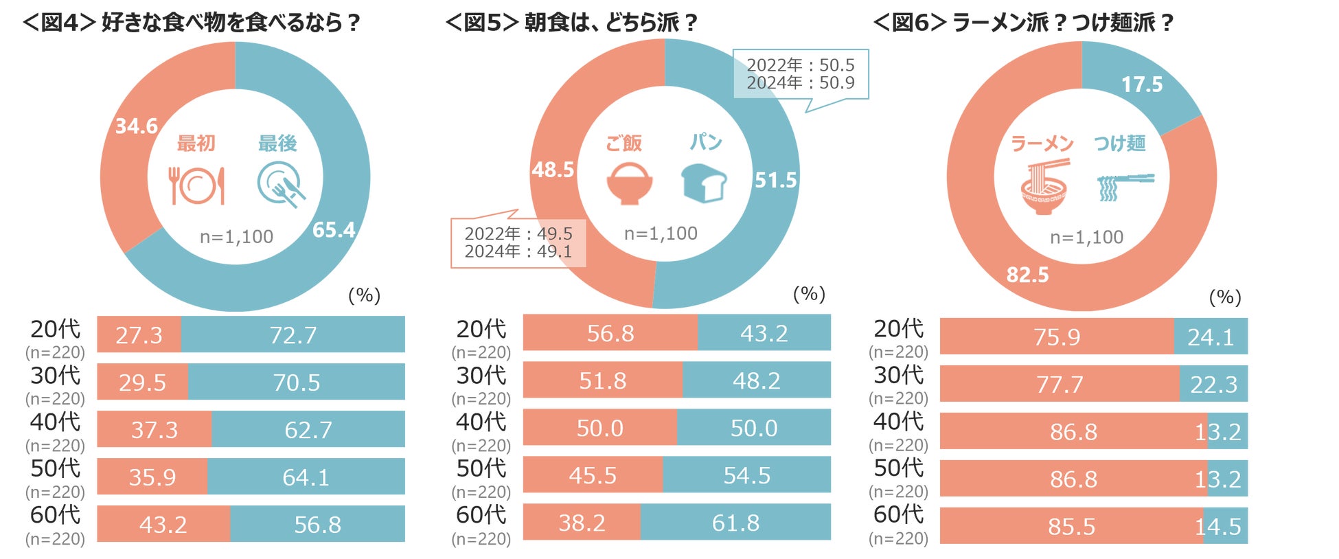 好きなものは「最初に食べる」よりも「最後に食べる」が65.4%で多く、20~30代は7割を占める。<図4~6>