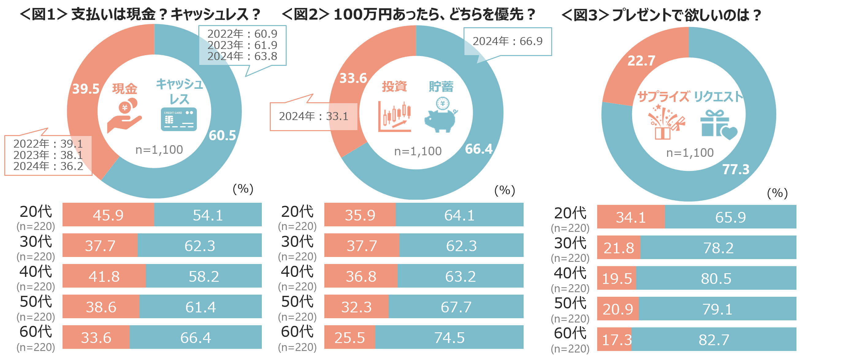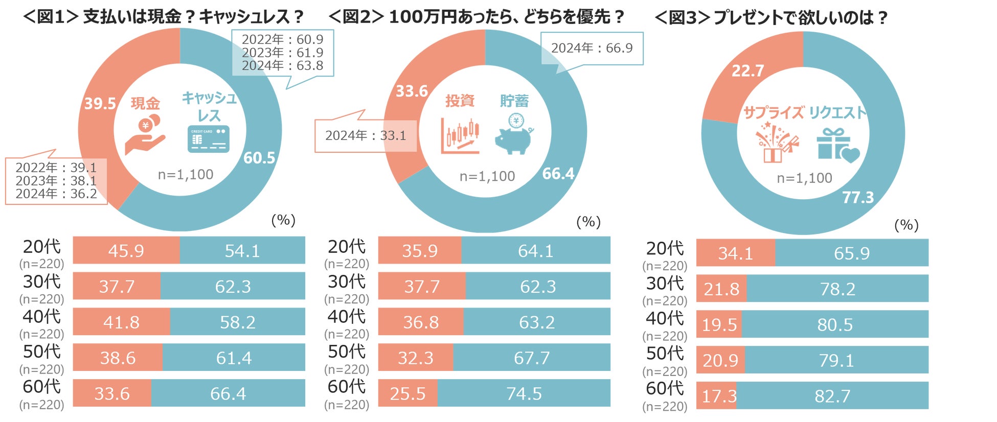 日頃の支払いはキャッシュレス派が60.5%。100万円あったら「投資」よりも「貯蓄」が優勢。<図1~3>