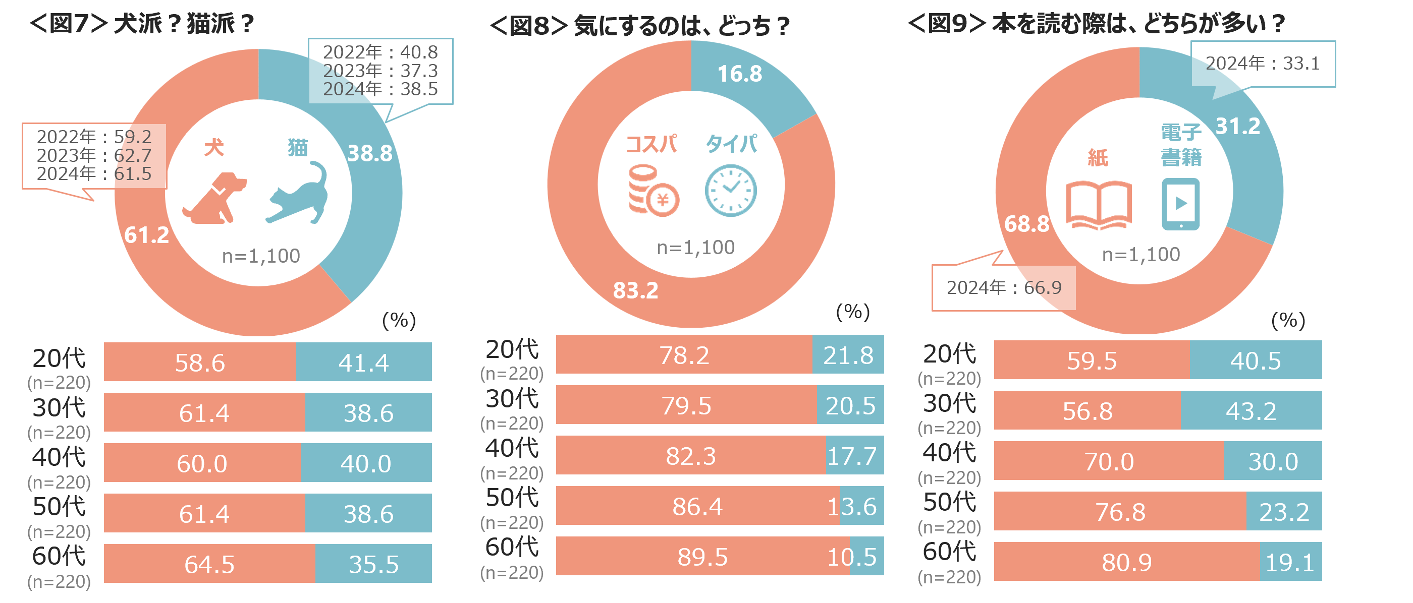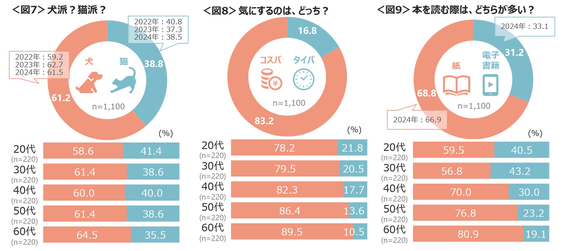 「猫」38.8%、「犬」61.2%と犬好きが上回る。「タイパ」より「コスパ」重視が8割超え。<図7~図21>