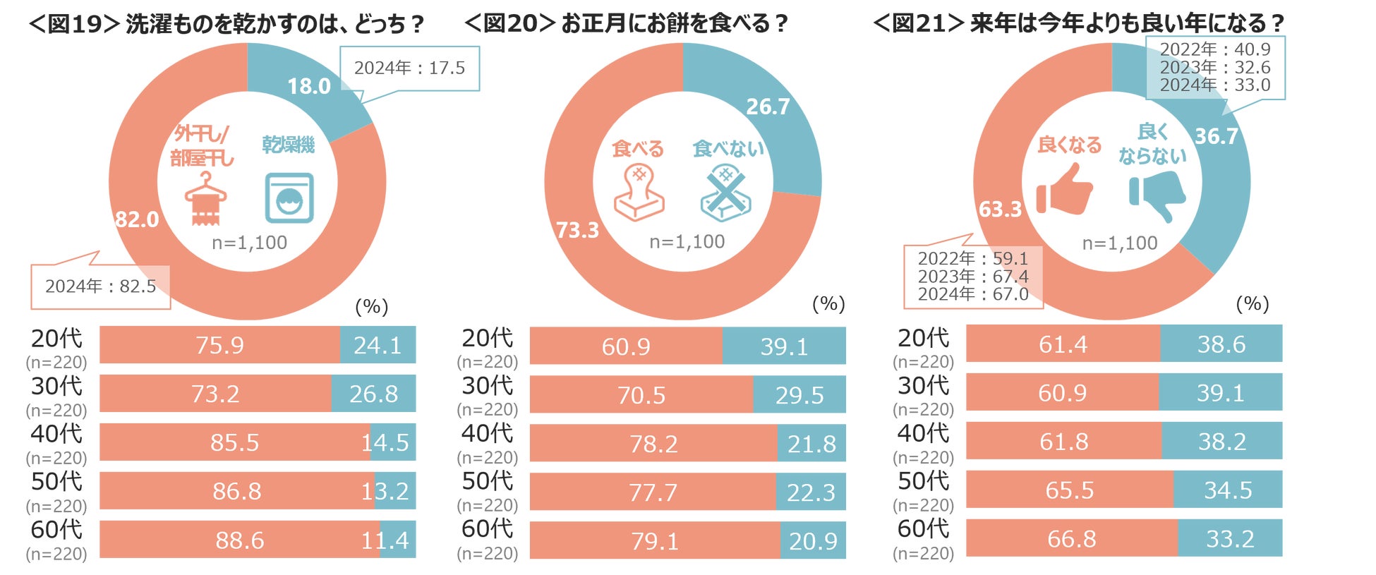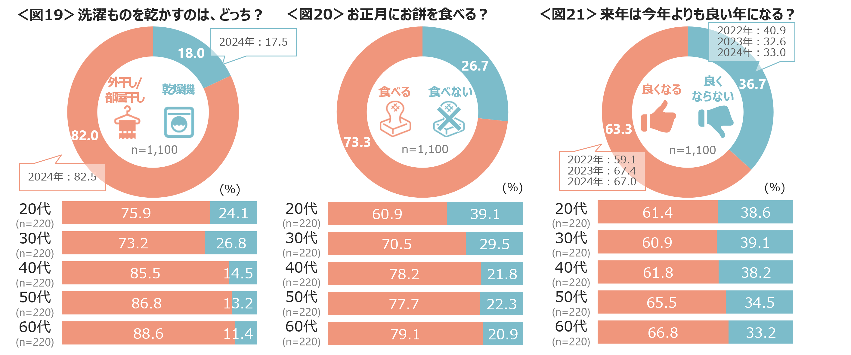 ・お正月にお餅を「食べる」人が73.3%と多い。20~30代は2~3割が「食べない」。