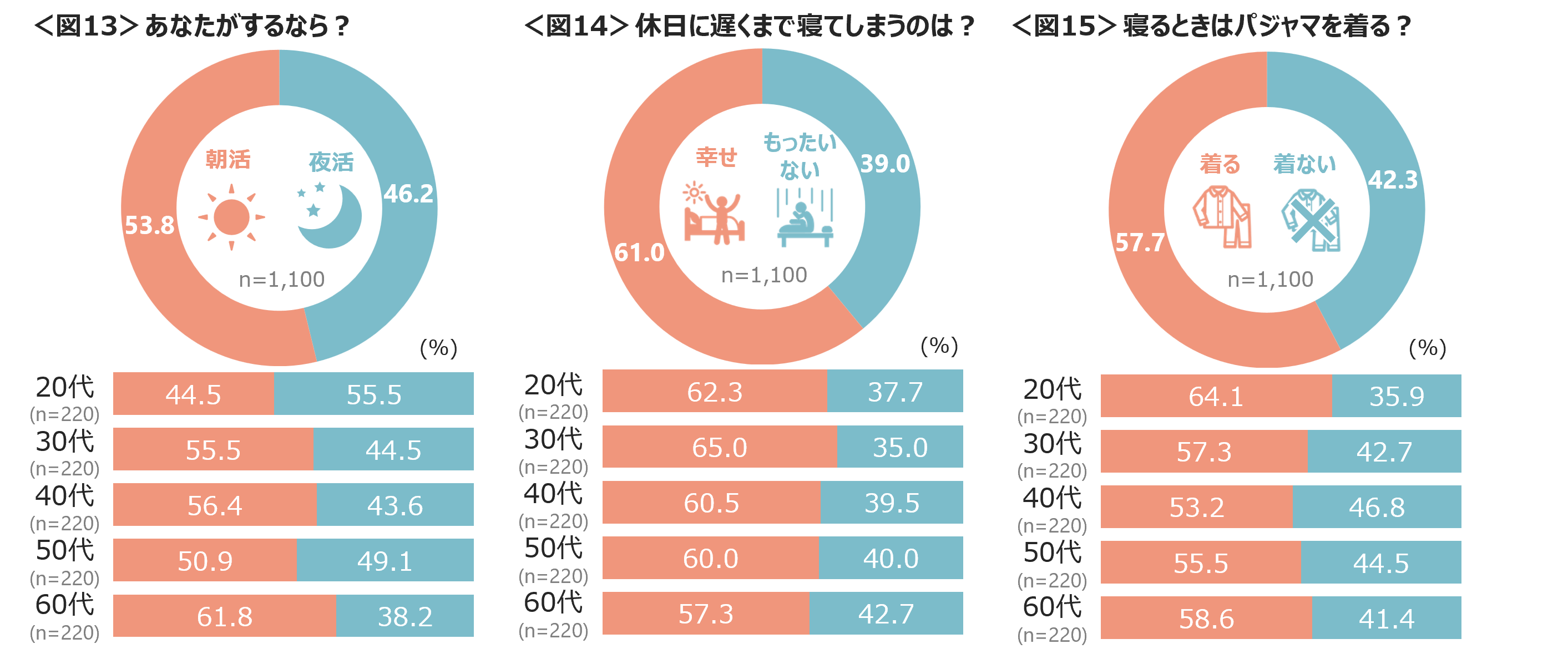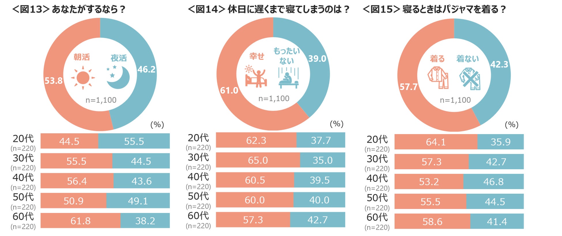 ・寝るときにパジャマを「着る」人は57.7%で、特に20代は6割以上が着ている。