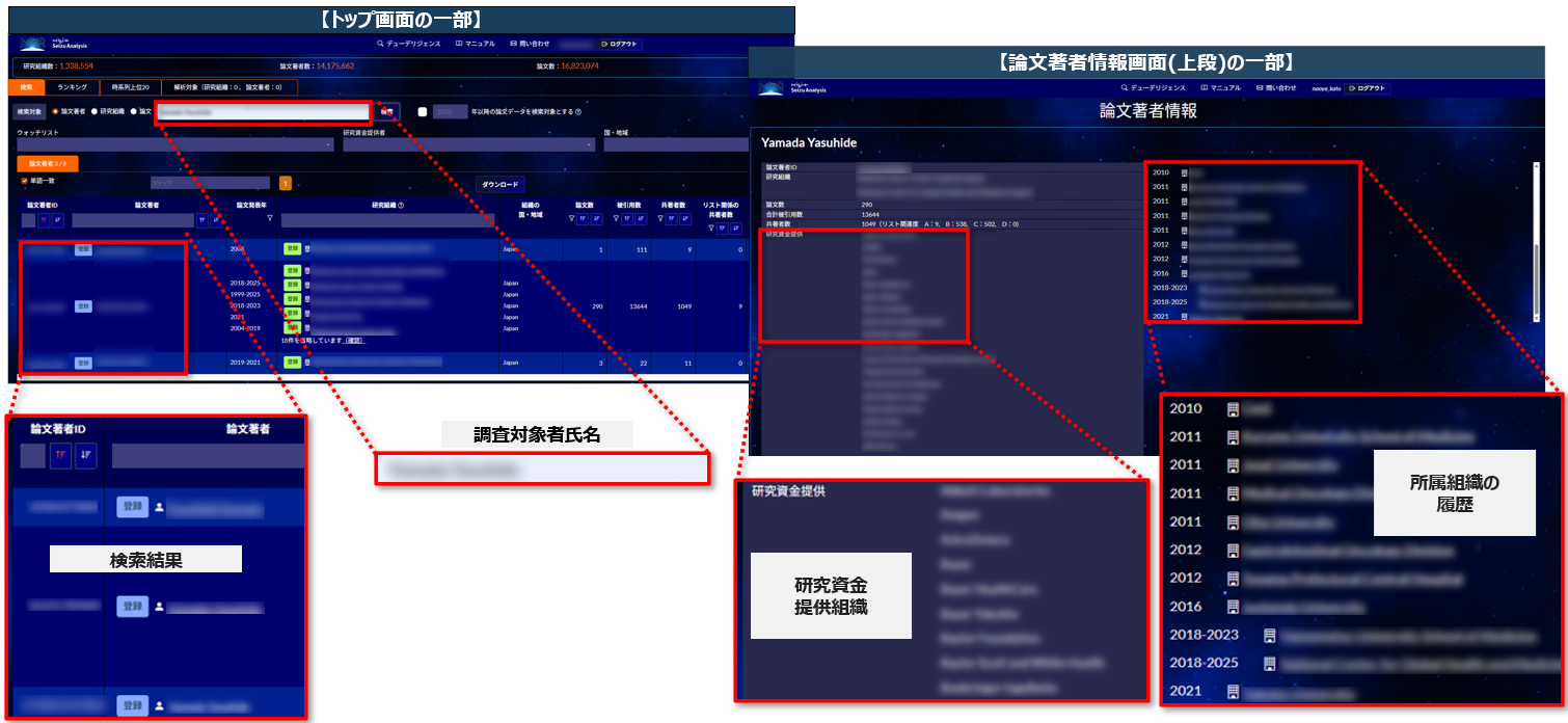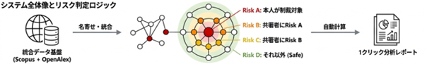 研究者名を本システムへ入力するだけで、論文共著者、所属組織、資金源などの情報を自動収集・解析し、これらを統合したリスク関連情報を網羅的に提示します。