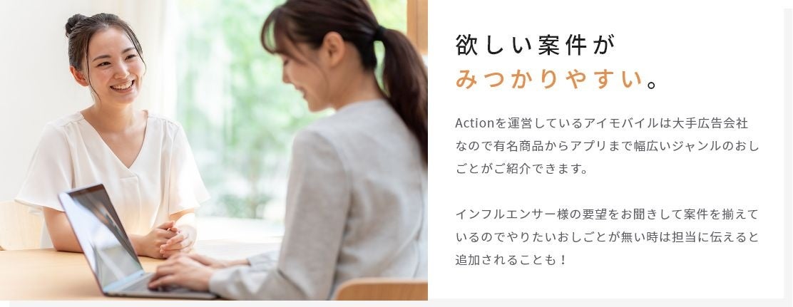 | ■Action登録方法 ★インフルエンサー様の新規ご登録はこちら https://action.i-mobile.co.jp/lp/partner/index.html?mid=202305_press_if ★インフルエンサーにプロモーションをご依頼されたい企業様はこちら https://affiliate.i-mobile.co.jp/advertiser/action/?mid=202305_press_cl |