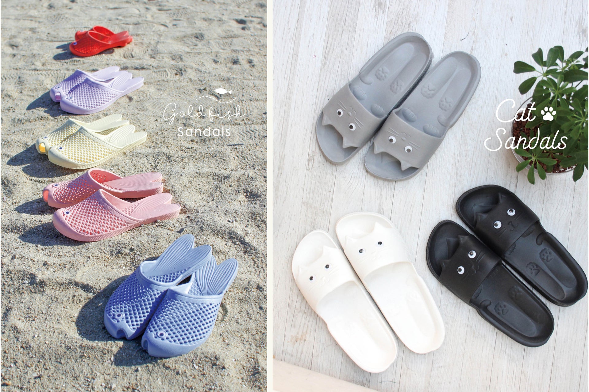 思わずクスッと笑ってしまう金魚と猫のサンダル。ベランダや玄関で待機している姿が何とも可愛らしく、歩くたびにキョロキョロ動く目は、見ているだけでも楽しい気分になります。
