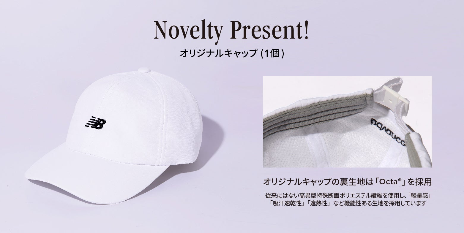 この春のフェアノベルティは昨年の秋フェアで好評を頂きました、数量限定の特製キャップのホワイトバージョン。素材の表地は見た目の風合いから品質の良さを感じさせるタッチ感の良いナイロンを使用。裏地には同じ直径のポリエステル繊維に比べて2分の1程度の軽量感を実現し、水や汗を通しやすくサラッとした快適な着心地を提供する吸汗速乾性、放射線状に配列した中空部と突起による繊維の空間に含まれる遮熱効果をもたらす優れたポリエステル素材「 Octa®(オクタ®) 」を採用している。素材の機能面だけでなく、柔らかな素材で被り心地も抜群。