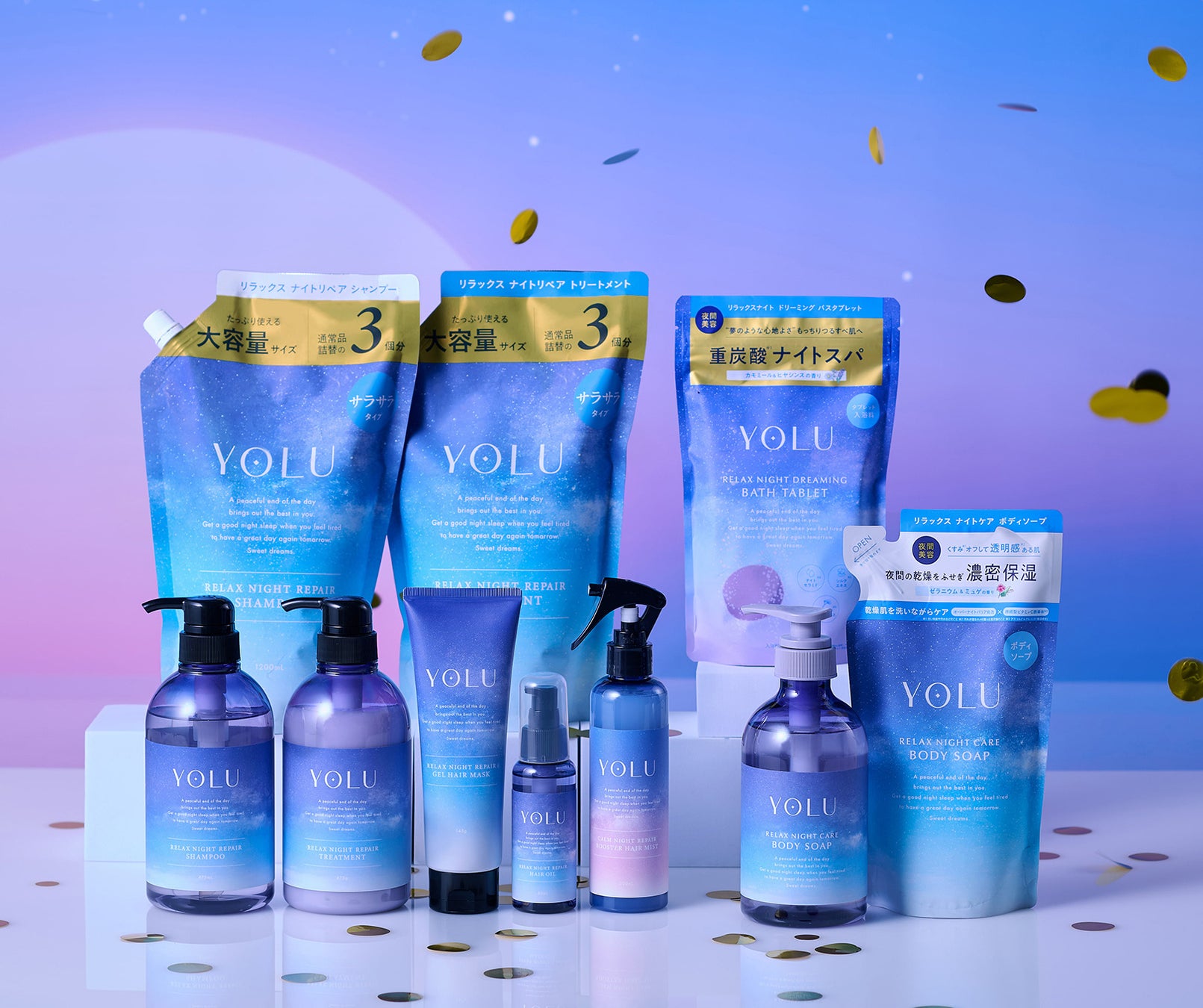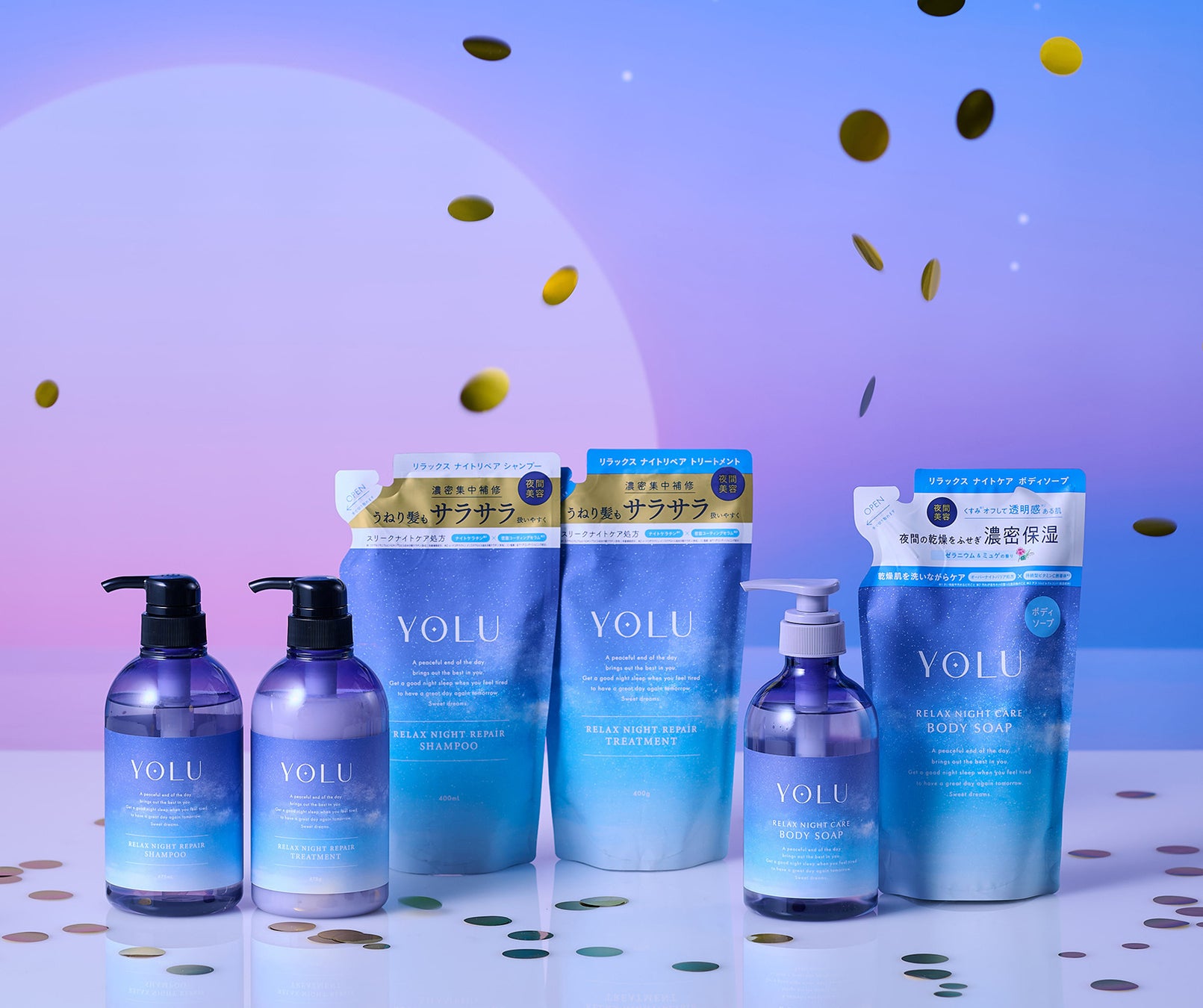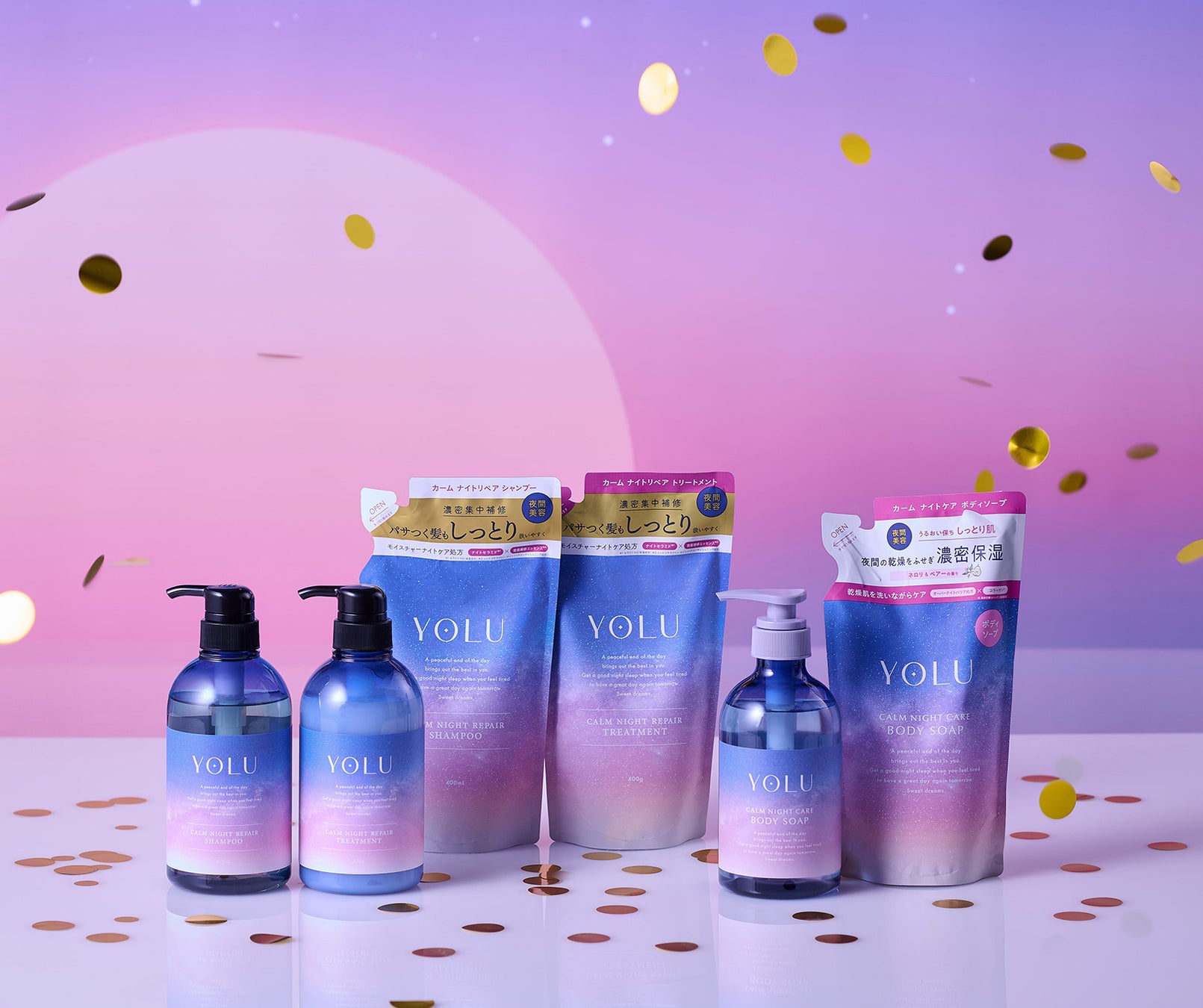 YOLUからは、ヘアケア商品7点に加え、新発売のボディケア商品2点が入った計10点セットが最大38%OFFでご購入いただけます。ヘアケアはなりたい仕上がりやお悩みに合わせて、カーム、リラックス、ディープの3タイプから選択できます。ヘアケアと同ラインのボディソープやバスタブレットが加わり、自分を労わる夜のバスタイムにぴったりのラインナップです。