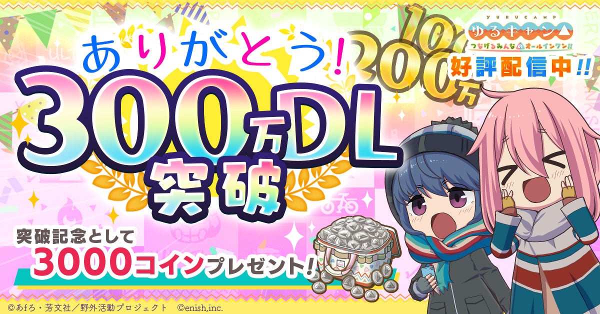 「ゆるキャン△ つなげるみんなのオールインワン!!」のダウンロード数が、ついに全世界で300万を突破いたしました。世界中のつなキャンパーの皆様、あたたかい応援に心より感謝申し上げます。