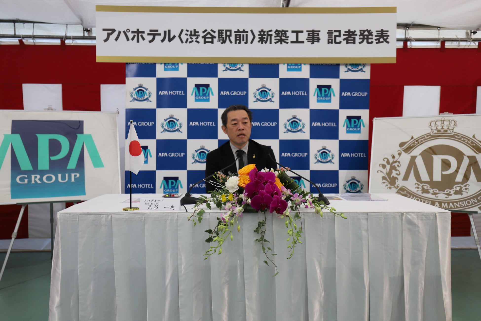 記者発表において、アパグループ社長 兼 最高経営責任者(CEO)の元谷 一志は、「ここアパホテル〈渋谷駅前〉は、渋谷区の条例など開発のハードルが高いエリアであるが、それを乗り越えて今日起工式を迎えたことをうれしく思う。現在、付近で営業中のアパホテル〈渋谷道玄坂上〉は隣地に74室の増築棟を工事中で、来年4月の開業を予定しており、今回の計画を含めて渋谷駅周辺では478室のドミナント出店となる。アパグループでは、3大都市圏や札幌・仙台・広島・福岡など大都市は直営店、その他エリアはフランチャイズやアパ直参画ホテルの拡大に注力するなど『選択と集中』により、ネットワークの拡充を進めるため、協力企業様とも一致団結して取り組んでいきたい」と述べた。