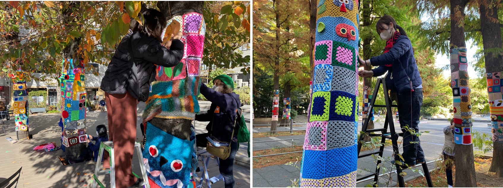 つないだモチーフを池袋エリア8か所の樹木や造形物に編みくるみ飾り付けます。