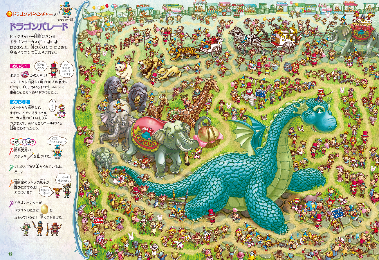 最新刊『ベストセレクション 大迷路 虎の巻』では、過去のシリーズ12作から名場面を1見開きずつ掲載しています。合計24問の迷路に加え、隠されているさがし絵は600以上! たくさんの難問・良問が、この1冊にぎっしり詰まっています!