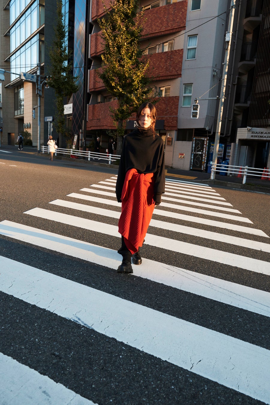 Y's × JOHN SMEDLEYのコラボレートコレクションを含む、ニットウェアのカプセルコレクションをSUMIREと表現するフォトイメージを公開。街(日常)と、人(SUMIRE)、Y'sのシルエット(服)が重なった、ある瞬間。