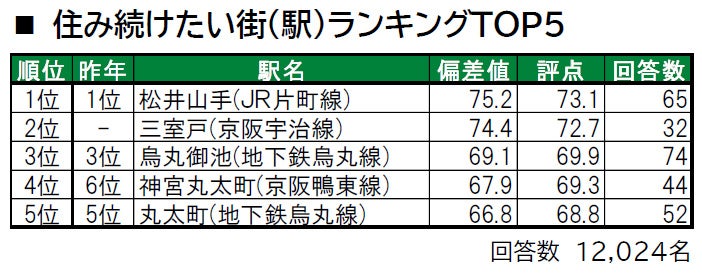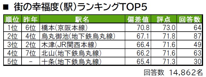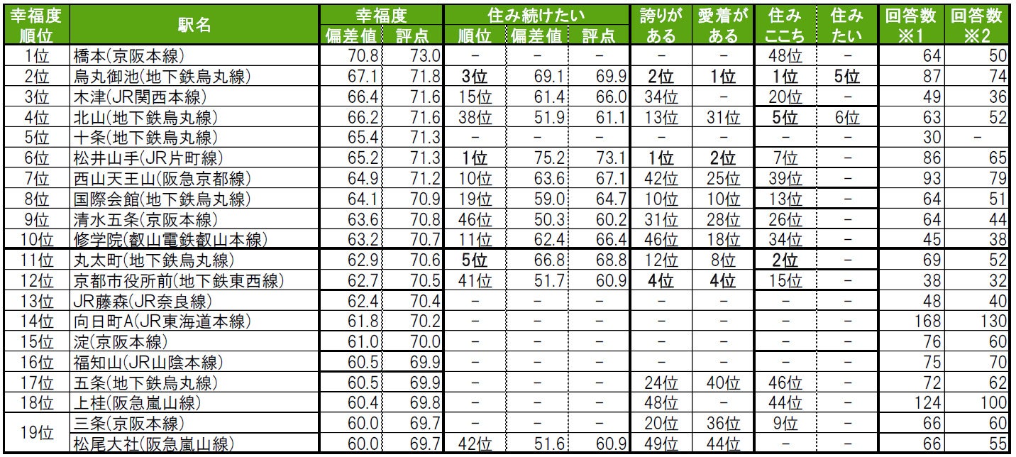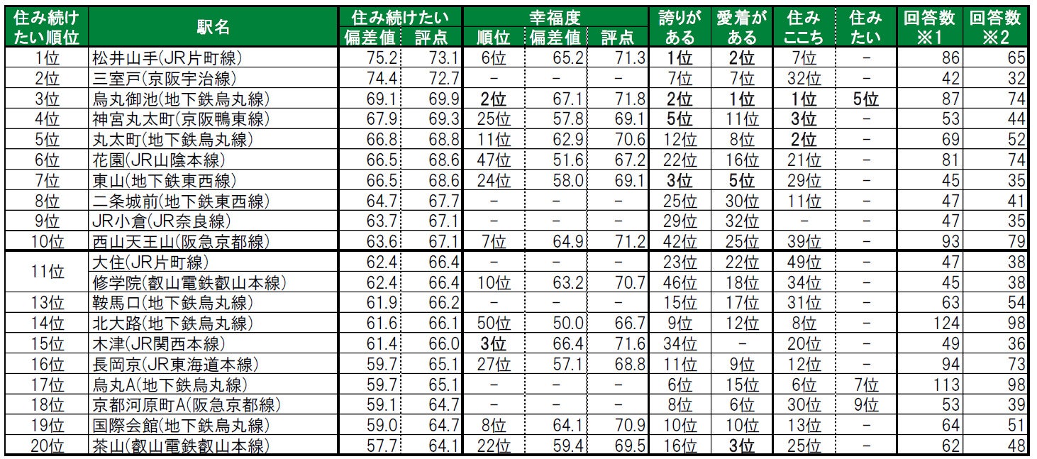 1位は2年連続で松井山手で、「街に誇りがある(駅)」でも1位、「街に愛着がある(駅)」では2位となっています。2位は三室戸で、昨年は累計回答数が30名未満だったためランキング集計対象外だった駅です。3位は2年連続で烏丸御池で、「住みここち(駅)」「街に愛着がある(駅)」1位、「街の幸福度(駅)」「街に誇りがある(駅)」2位、「住みたい街(駅)」5位と、各ランキングで高評価を得ています。