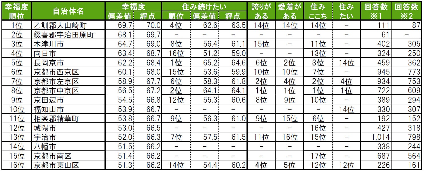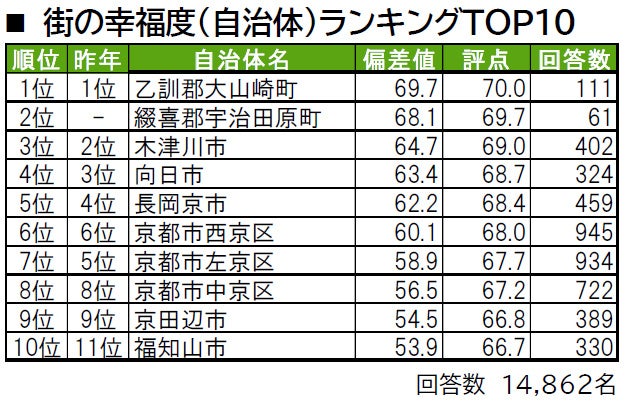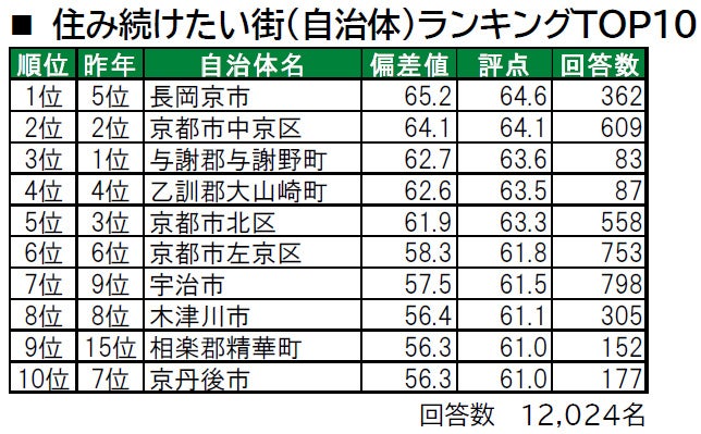 1位は2年連続で乙訓郡大山崎町で、「住み続けたい街(自治体)」では4位となっています。2位は綴喜郡宇治田原町で、昨年は累計回答数が50名未満だったためランキング集計対象外だった町です。3位は木津川市で、「住み続けたい街(自治体)」では8位となっています。
