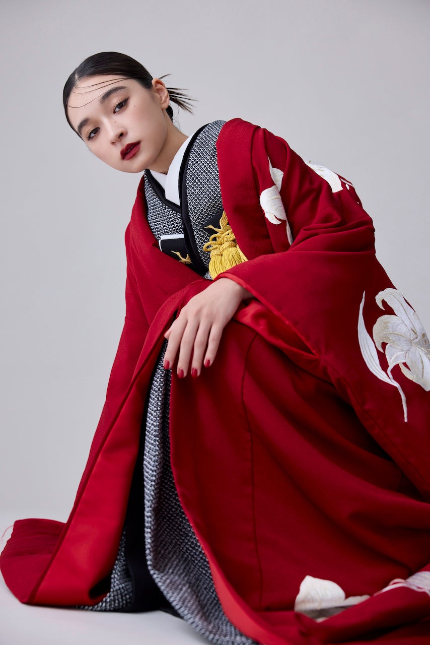 黒絞りの色掛下を合わせることで上品かつクールな印象。肌なじみよくパッと華やかに引き立てる深紅の染色で、シンプルな百合の刺繍は控えめながら存在感のある配置に。
