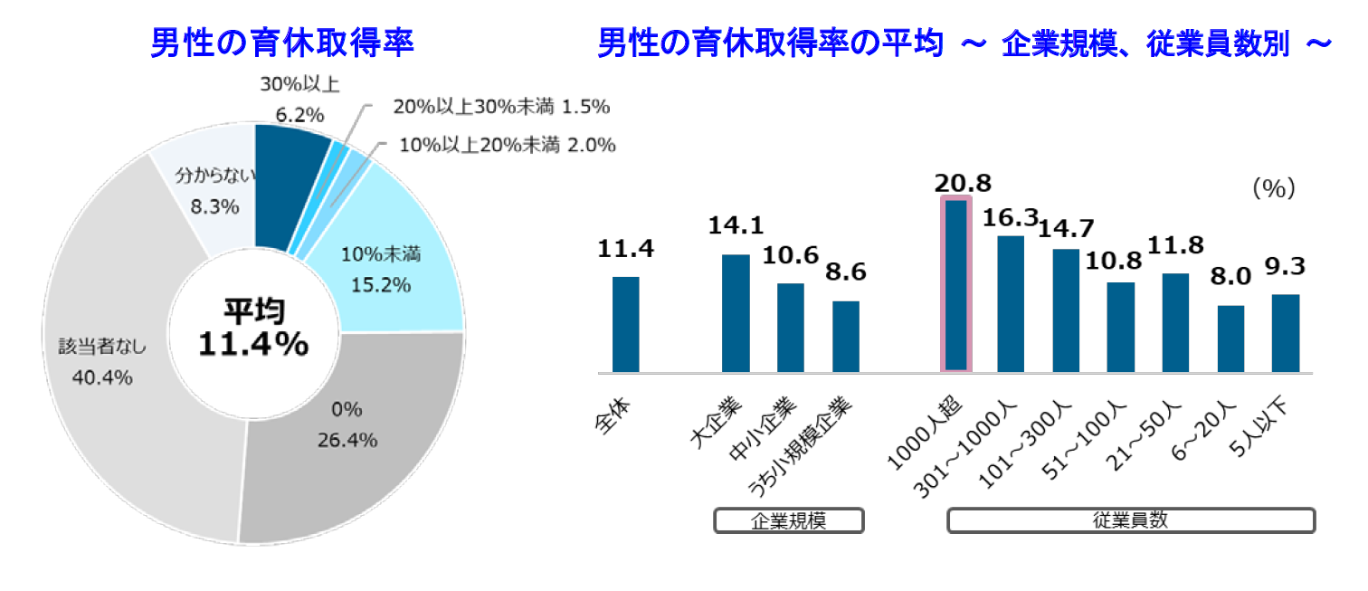 男性の育休取得率の平均は11.4%、特に従業員数「1000人超」の企業で高く