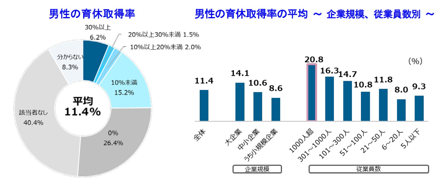 男性の育休取得率は平均11.4%、特に従業員数「1000人超」の企業で高く