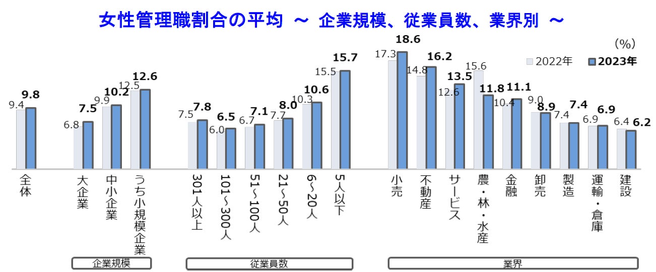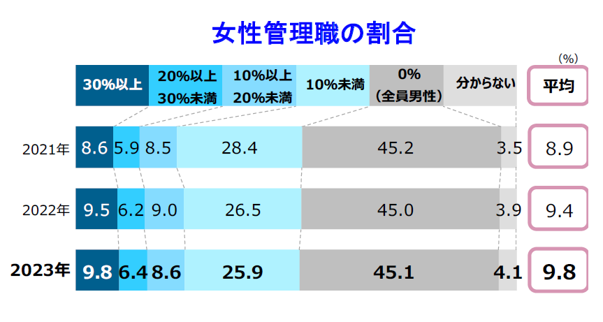 女性管理職割合の平均は9.8%と過去最高も、1割に届かず