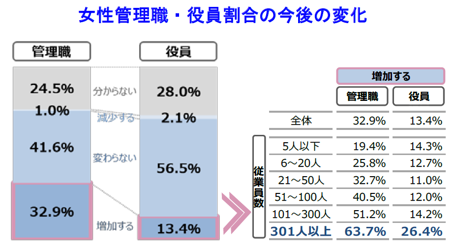 今後女性管理職割合が「増加する」と見込む企業は32.9%、女性役員割合は13.4%に