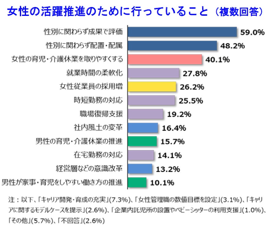 女性の活躍推進のために自社で行っていることについて尋ねたところ、「性別に関わらず成果で評価」が59.0%でトップ、「性別に関わらず配置・配属」(48.2%)が続き、男女平等に関わる項目が上位に並んだ。次いで、「女性の育児・介護休業を取りやすくする」(40.1%)といった、女性に特化した働きやすい環境づくりに関する対応策が続いた。