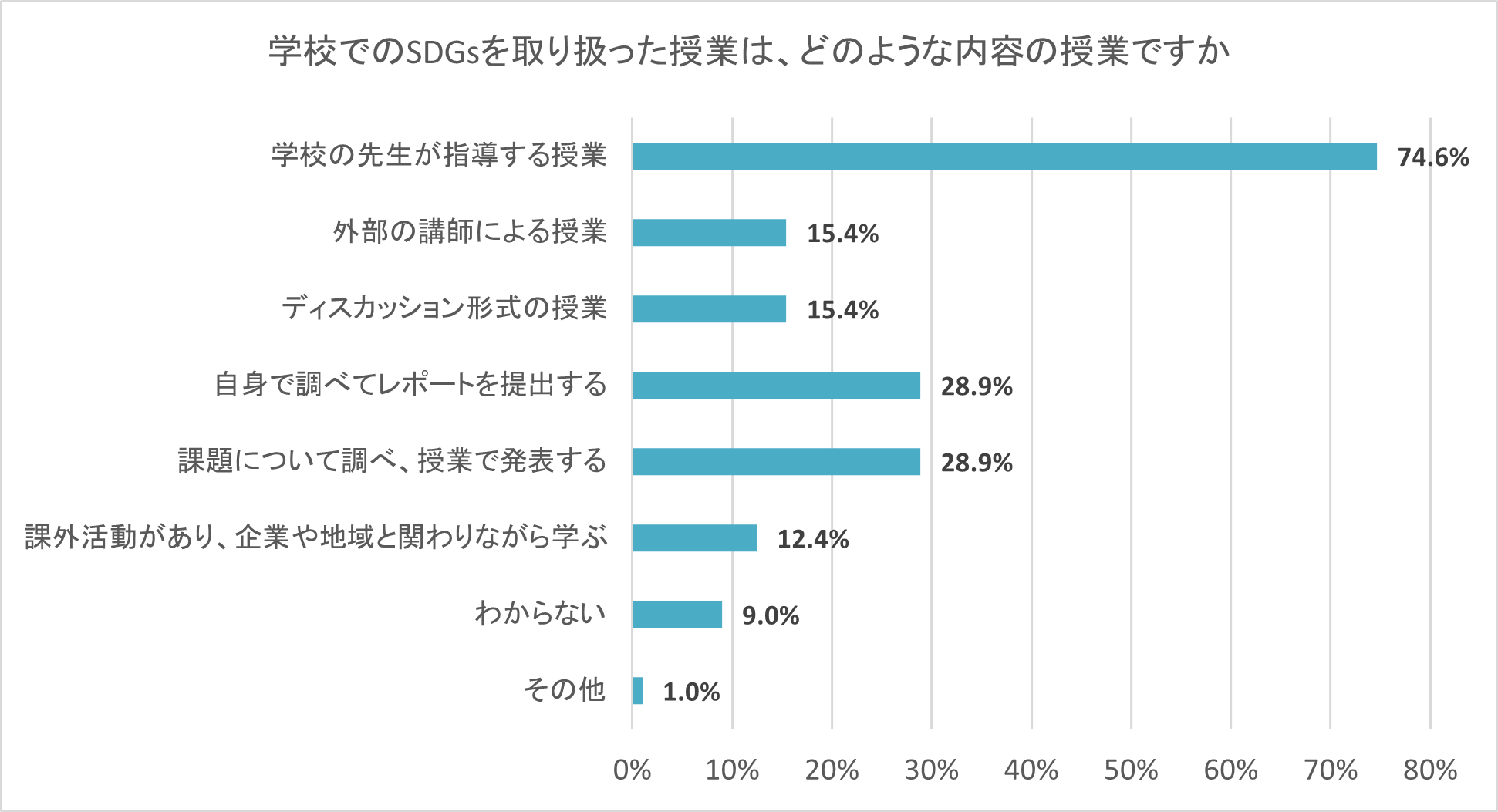 最も多かったのは、「学校の先生が指導する授業」で、74.6%だった。また、「自身で調べてレポートを提出する」形式や「課題について調べ、授業で発表する」形式の授業も3割弱が経験していることがわかった。