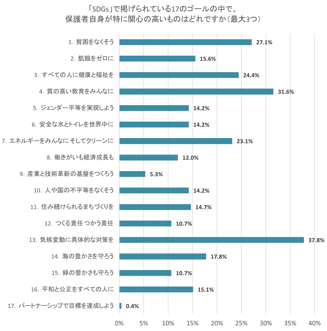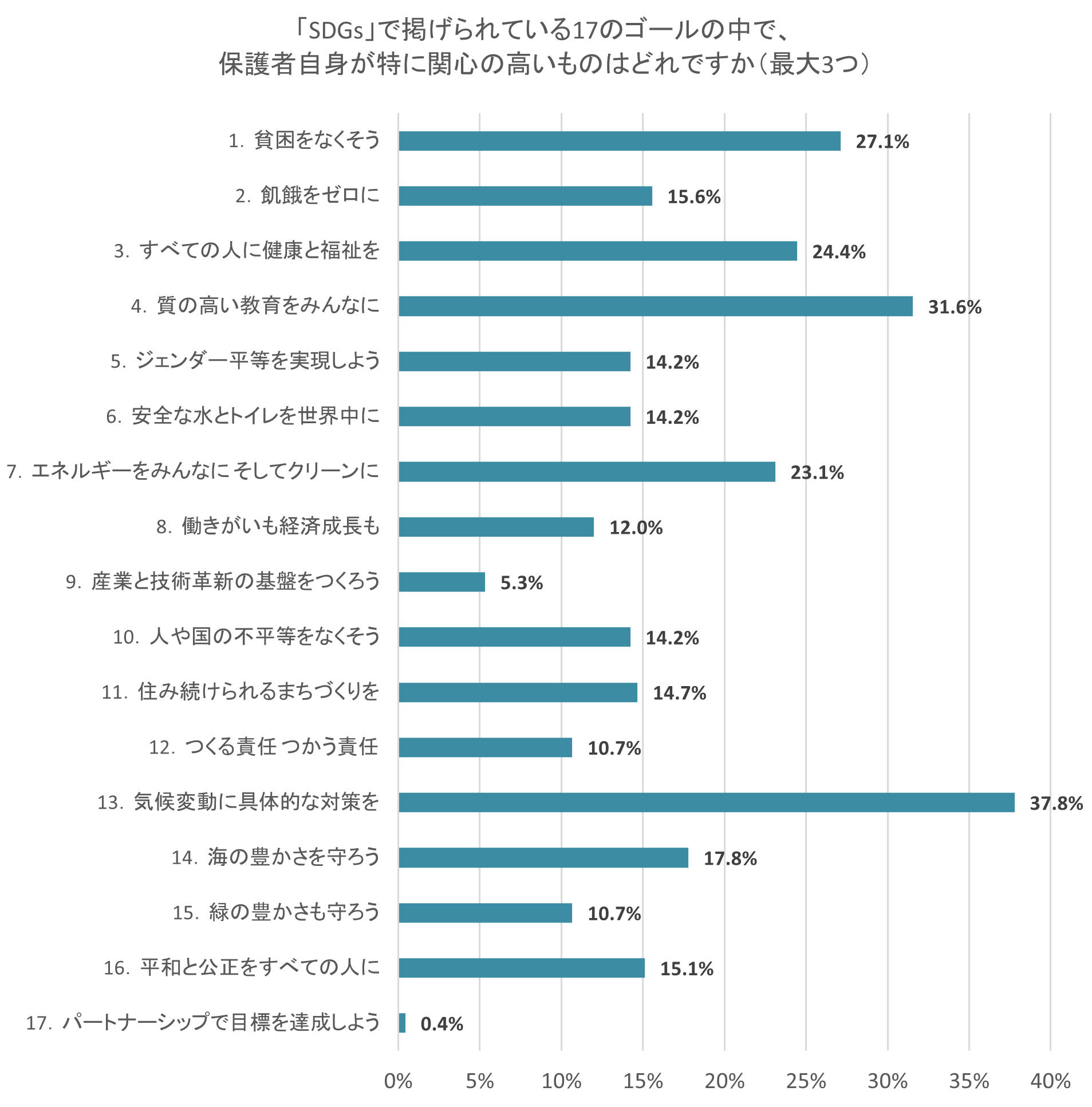 最も保護者の関心が高いゴールは「13.気候変動に具体的な対策を」で、37.8%にのぼった。