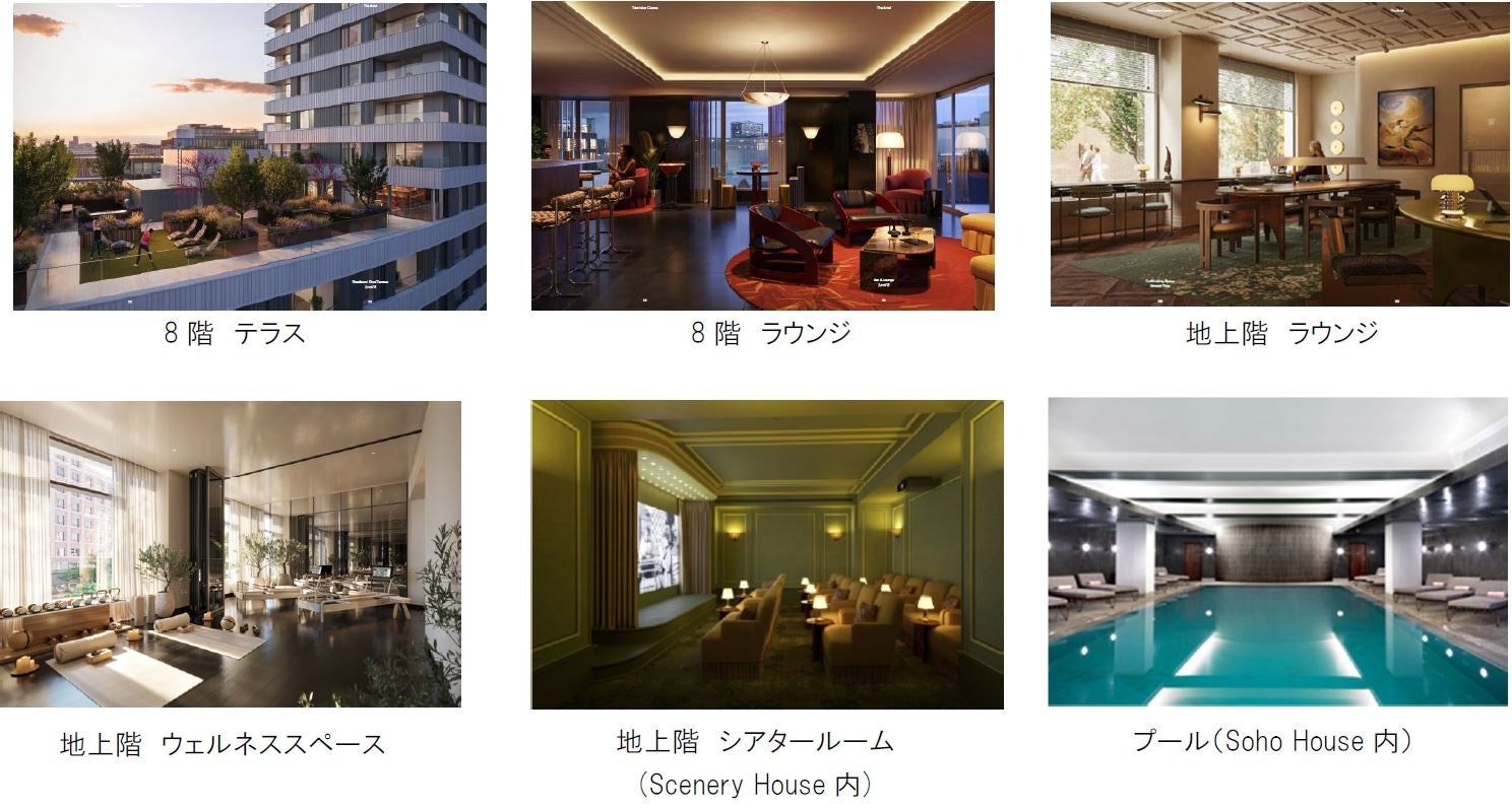 The Ariel内:ラウンジ、ウェルネススペース、テラス、ダイニングスペース Scenery House内:ラウンジ、シアタールーム Soho House内:ジム、プール |