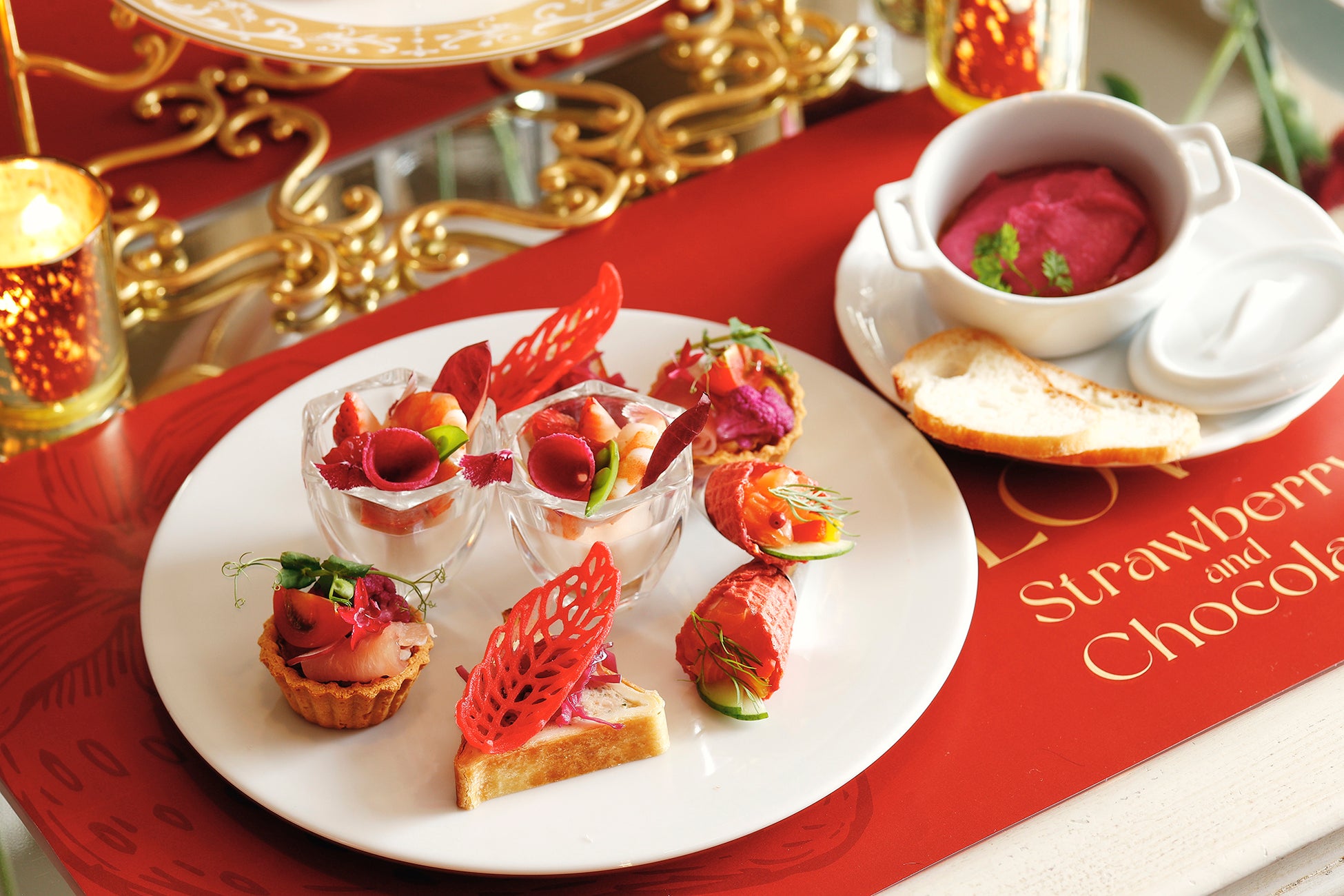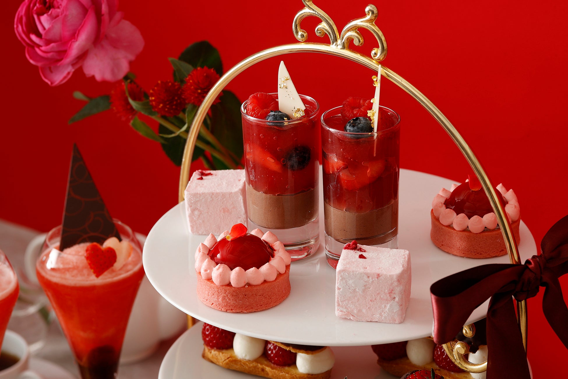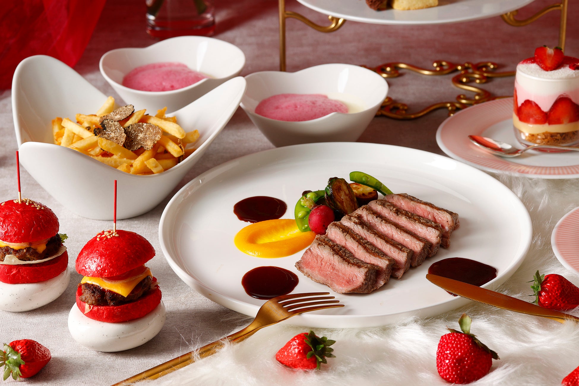 セイボリーは赤を基調とした彩り豊かなメニューをご用意いたしました。紫キャベツのシュークルトを添えた鶏のパテ・アンクルート、ひよこ豆とビーツのフムス、いちごを飾ったカリフラワーのベリーヌなどをラインナップ。東京湾の景色が一望できるテラスを併設するフレンチダイニング マンハッタンでは、熟成牛のグリルステーキ、自家製のバンズを使用したミニハンバーガー、トリュフフレンチフライ、スープ付きのプランが新たに登場いたしました。また、ニューヨークラウンジでは、いちごとチョコレートをアレンジした濃厚なスペシャルモクテルをオプションでご用意し、バレンタインシーズンを華やかに彩ります。