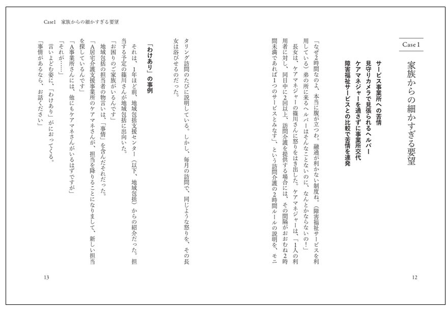 家族からの細かすぎる要望、利用者からの暴言など、多く寄せられる相談内容を物語形式でわかりやすく、リアリティがあるように例示しました。